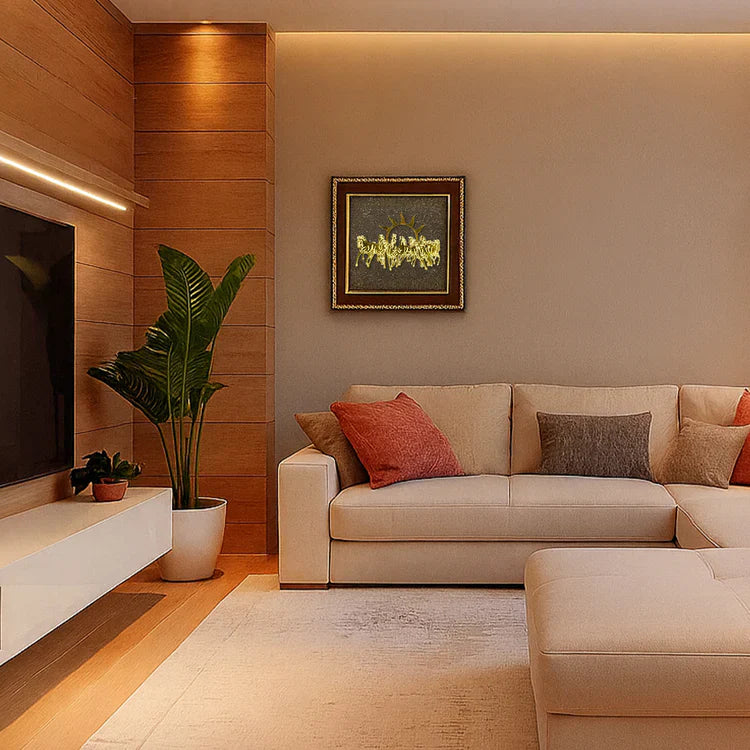 The image of seven galloping horses pulling the chariot of the Sun God (Surya Dev) is one of the most powerful symbols in Vastu and Feng Shui. They symbolize: